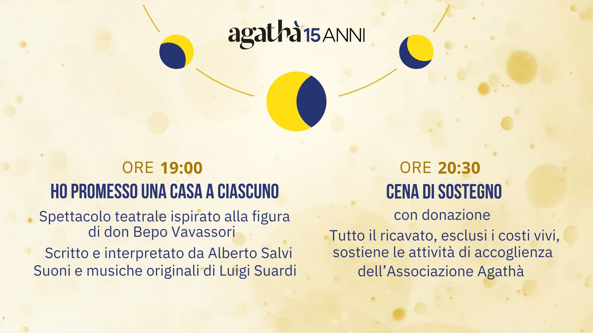 Con questo evento vogliamo cominciare a raccontare la storia di Agathà e di tutto ciò che da qui è arrivato in questi 15 anni: le case, le persone, l’aiuto e le possibilità.